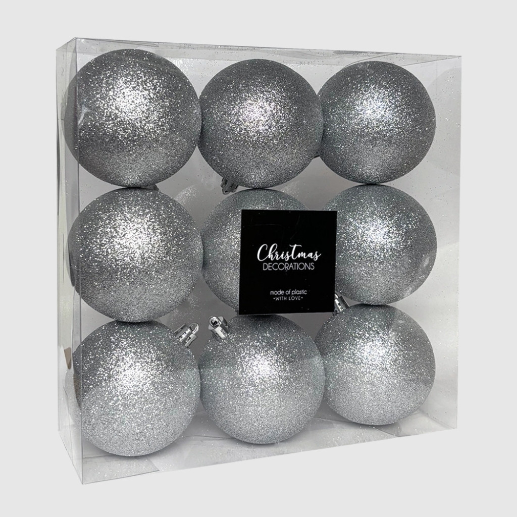 Az ezüst glitteres műanyag karácsonyi gömb szett elegáns és modern fényt varázsol minden karácsonyfára. A szettben 9 darab, 8 cm-es gömb található, melyek csillogó felülete különleges ragyogást kölcsönöz az ünnepi dekorációnak. A klasszikus ezüst szín a karácsony időtlen eleganciáját idézi meg, miközben harmonizál bármilyen más színvilággal – legyen szó arany, piros, kék vagy zöld díszekről.