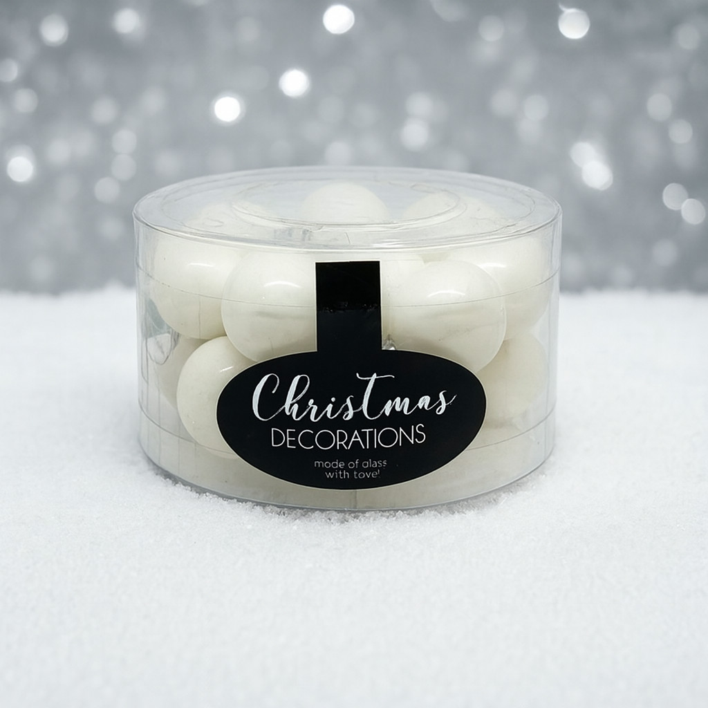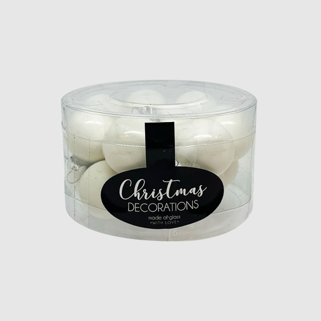 A magas minőségű üvegből készült díszek finom kontrasztot adnak fényes és matt felületük váltakozásával, amely különösen szépen érvényesül gyertyafényben és ünnepi fényfüzérek mellett. A praktikus, átlátszó hengeres csomagolás stílusos tárolást biztosít, és ajándékozásra is tökéletes.