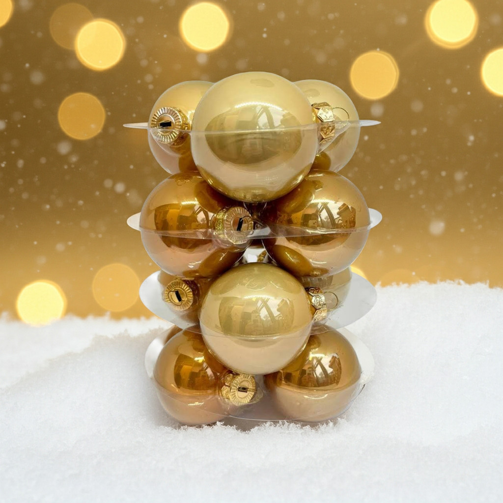 Ez a 12 darabos aranyszínű üveg karácsonyi gömb szett igazi fényt és luxust kölcsönöz a karácsonyfának. A 6 cm-es méretű gyöngyház felületű gömbök elegáns csillogásukkal és időtlen megjelenésükkel teszik különlegessé az ünnepi dekorációt. Az üveg kifinomult fényjátéka a karácsonyi fényekben életre kel, így minden szögből gyönyörű látványt nyújt.