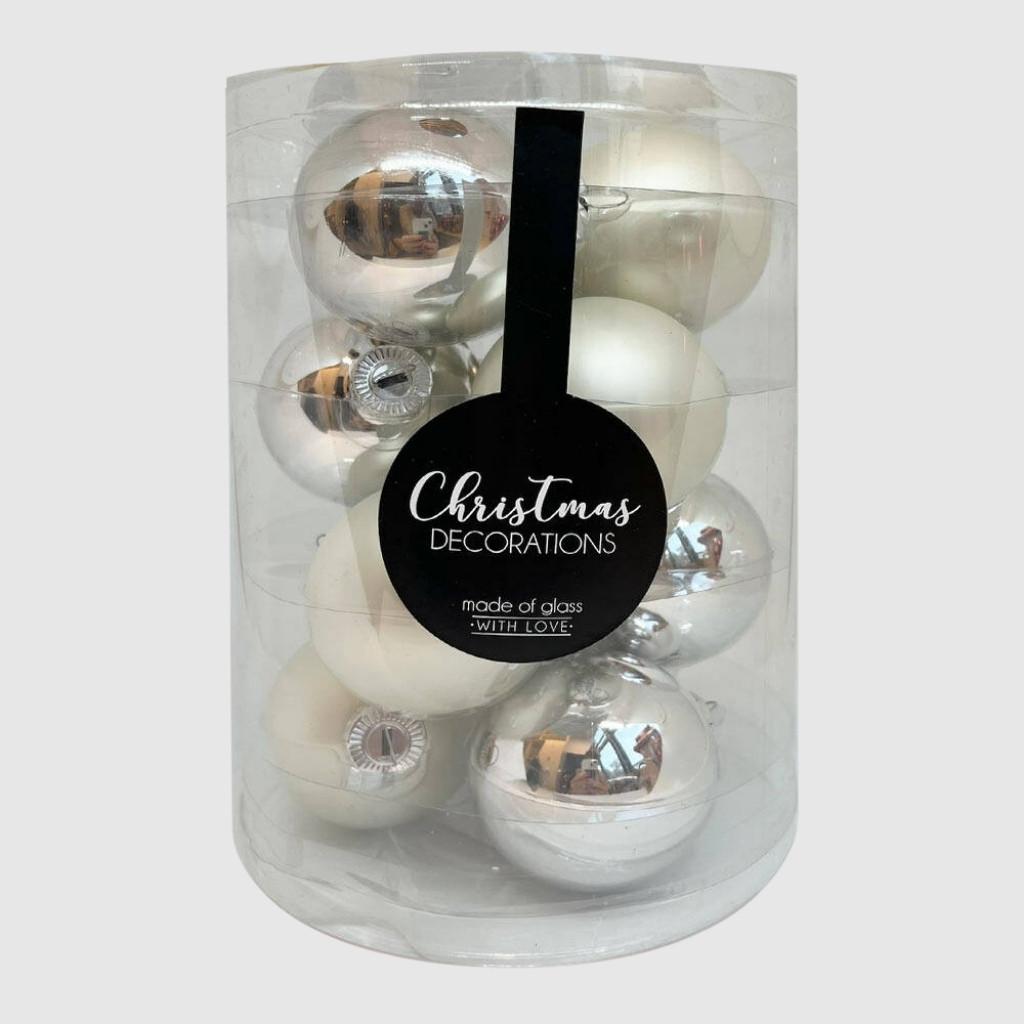 Ez a 12 darabos, fényes és matt felületű ezüstszínű üveggömb szett a karácsonyi dekoráció igazi alapdarabja. A 6 cm-es méretüknek köszönhetően tökéletesen illeszkednek a fenyőfa ágainak harmóniájába, miközben kifinomult ragyogásukkal elegáns és időtlen ünnepi hangulatot teremtenek. A fényes gömbök csillogása gyönyörűen tükrözi vissza a fényeket, míg a matt változatok diszkrét lágyságot adnak a kompozíciónak.