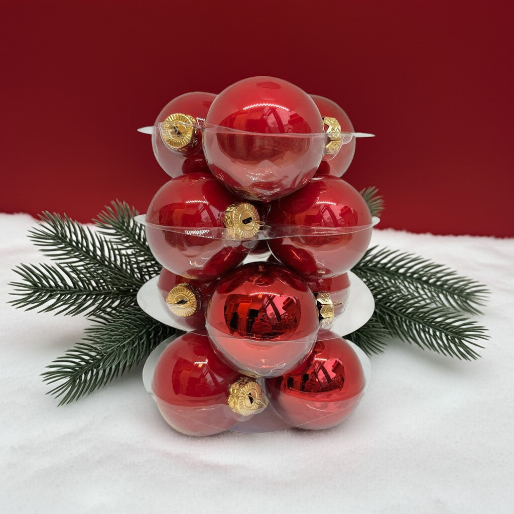 Ez a 12 darabos, 6 cm-es piros üveggömb szett a gyöngyház- és fényes felületek tökéletes egyensúlyát nyújtja. A karácsonyfa minden ágát ragyogó piros színnel díszíti, amely a szeretet és az ünnepi hangulat örök szimbóluma. Tökéletes választás mindazok számára, akik a klasszikus karácsonyi stílust kedvelik, és elegáns, harmonikus dekorációt szeretnének otthonukba.